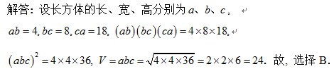 长方体有一个公共顶点的三个面的面积分别为4, 8, 18, 则此长方体的体积为