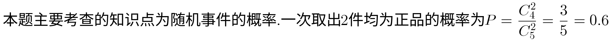 一批产品共有5件,其中4件为正品,1件为次品,从中一次取出2件均为正品的概率为