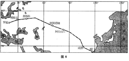 图8示意厦蓉欧国际货运班列(厦门成都波兰罗兹)路线。读图8,完成39-40题。