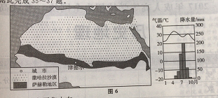 非洲萨赫勒地区荒漠化严重,非洲联成员国布望通过实施”绿色长城”计划,来遏止撒哈拉沙漠扩张,图6示意萨赫勒地区范围和尼日尔南部城市津德尔(1348N,859E)的气温和降水分布。据此完成35~37题