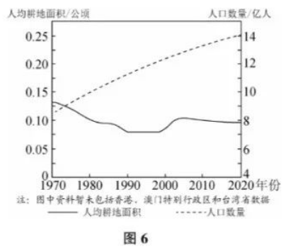 图6示意1970~2020年我国人口数量及人均耕地面积变化。读图6.完成32~33题。
