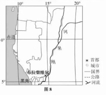 刚果(布)国家1号公路(图8)由中国企业建设,是落实中非合作论坛会议精神的重要组成部分,也是“一带一路”倡议在刚果(布)落地生根的精品项目。该公路沿线环境20°复杂多样,有原始森林、丘陵、沼泽,公路的修建遵循了“绿色建造、环境和谐”的方针。据此完成36~37题。
