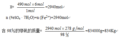 某工厂废水中Cr2O72-浓度为4.9 × 10-4mol/L,其毒性较大,可用绿矾(FeSO4 · 7H2O)处理成无毒的Cr3+,写出反应的离子方程式;如处理1000m3的此种废水,计算至少需要含量为98%的绿矾多少千克?(注:杂质不参与反应)