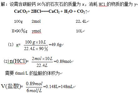 (10分)用含碳酸钙90%的石灰石(杂质不跟盐酸反应)与6mol/L的盐酸反应来制取10L(标准状况下)二氧化碳,试计算