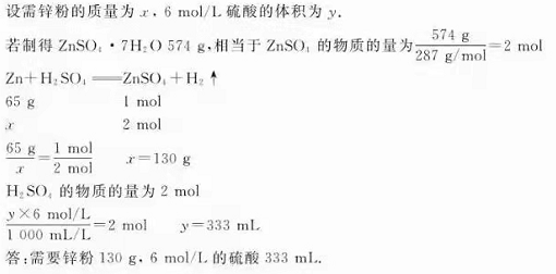 用锌粉与6mol/L的硫酸制备皓矾(ZnSO4·7H2O),若要制得574g的皓矾,需要多少克锌粉和多少毫升6mol/L的硫酸(结果保留整数)