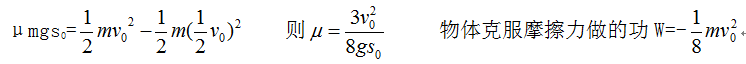 质量为m的物体以初速度V0在粗糙的平面上滑行。一段距离S0后,速度变为1/2V0,则物体与平面间的动摩擦因数为_______。物体的速度从1/2V0减少到0的过程中物体克服摩擦力所做的功为_______(重力加速度为g)。