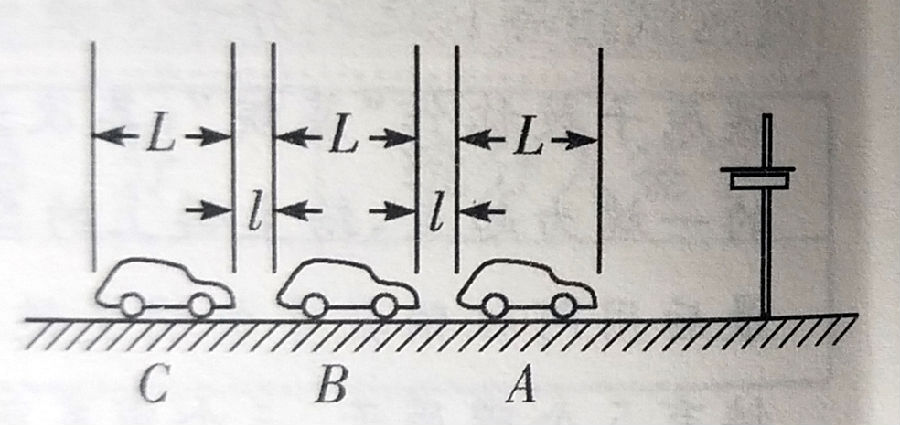如图在十字路口有三辆长均为L=3米的小汽车A 、B、C在等待放行的绿灯,两车之间的距离均为l=0.5米,绿灯亮后A车开始启动,经过t=0.5秒B车开始启又经过同样的时间C车开始启动,若三辆车的运动均可视为匀加速运动,加速度的大小均为a=2m/s2,求:当C车启动时,AC两车之间的距离s 。