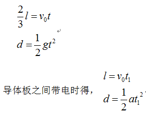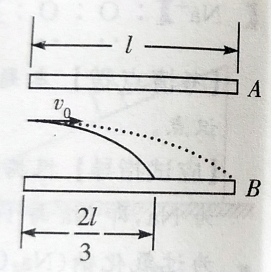 如图一带正电的粒子以水平速度V0射入长为l水平放置的两平行导体板之间,当导体板不带电时,带电粒子落在B板上距射入端处。现示AB两导体板带上等量异号的电荷,则在同一位置以相同的速度射入的带电粒子,恰好可以达到B板的边缘,求此时两极板间电场强度的大小,已知两次射入的带电粒子的质量均为m,电荷量均为q,重力加速度为g,(不计空气阻力)