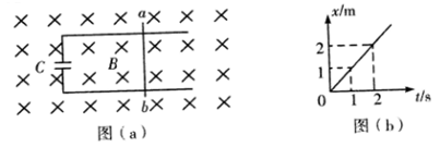 如图(a),两根足够长的光滑平行金属导轨,间距L=0. 2m,导轨左端连接一电容量C=1μ F的电容器;一匀强磁场垂直于导轨所在平面,磁感应强度大小B=0.1T。金属杆以在导轨上运动,运动过程中杆与导轨接触良好且保持垂直,杆移动距离x与时间t的关系如图((b)所示。求充电完成后,电容器极板所带的电量。
