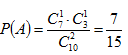 一个袋中有10个乒乓球,其中7个橙色,三个白色,从中任取2个,设事件A为“所取的2个乒乓球颜色不同”,求事件A发生的概率P(A)。
